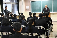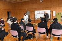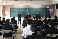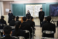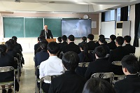これまでの自分の経験談や会社についての紹介の後、仕事をする上での「苦労」や「喜び」について、さらには三石への熱い思いを聞かせていただきました。生徒は初めて知ることが多くあり、とても興味津々な様子でした。この講話を自分の将来を考える1つのきっかけにしてください。 |