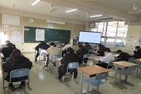 10月31日(金)、地震を想定した避難訓練がありました。休み時間に警報音が鳴り響き、教科書等の身の回りにあるもので頭を守りながら武道場に避難をしました。