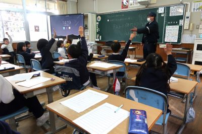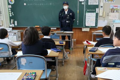 | 2年生が吉永駐在所のおまわりさんに来てもらい、お話をしていただきました。毎日登下校を見守ってくださったり、道ばたで会うと話しかけてくださったりする身近な存在のおまわりさんです。「なんで、おまわりさん、というのですか?」「おまわりさんになるには、どうしたらいいですか?」など、質問したいことがいっぱいの子どもたち。ひとつずつ、丁寧に答えてくださり、子どもたちにとって、一層身近な存在になりました。 | |