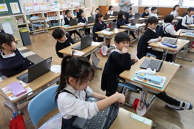 | 今年は5年間使ったタブレットPCの入れ替えの年になっています。「新しいタブレットPCが届いたらね。」という約束で、ずっと待っていた1年生にも、ようやくやってきました。今朝、1年教室に計画委員会の5、6年生が来てくれて、タブレットPCを使うときの約束や気をつけるとこ、便利な使い方などの話をしてくれました。そして、代表の子の手に渡りました。この瞬間から、1年生の学びがさらに広がり始めます。 | |