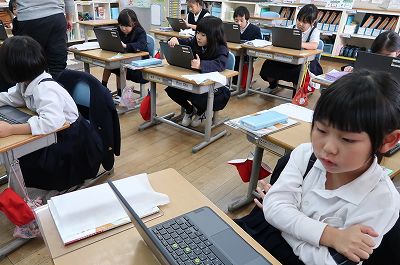 | ついに1年生がタブレットPCデビューしました。もう少し早く触らせたかったのですが、今年度はちょうど端末の入れ替えになっていて、新しいものが準備できるまで我慢していました。担任から画像が一斉送信されると「わーっ!」。画面に触ると次に進んで「わーっ!」。ひとつひとつが感動の瞬間でした。それでもやっぱり現代っ子です。家で触ったことのある子が多く、すぐに使いこなせそうです。 | |