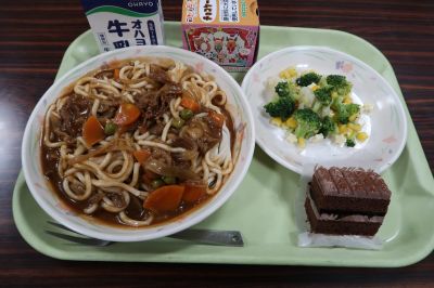 | 昨日の冬至は「かぼちゃ」と「ゆず」のメニュー、そして今日はクリスマスメニュー。普段でも給食を楽しみにしている子どもたち。イベントデーにちなんだ献立の日は特に人気です。ネーミングもすてきです。サラダは「もみの木サラダ」です。教室では最後にとっておきのチョコレートケーキを思いっきり頬張っていました。 |