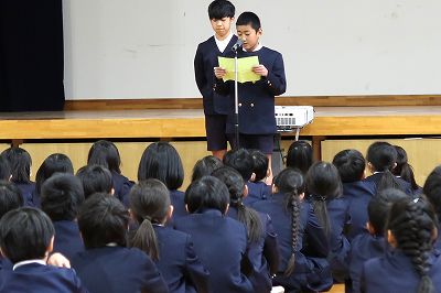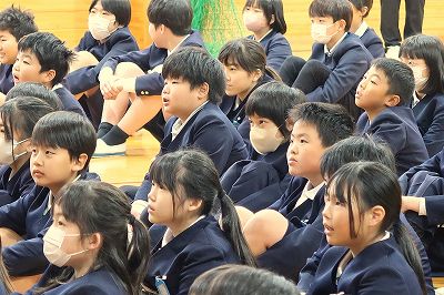 | まだ何人かはインフルエンザによる欠席があるものの、すっかり落ち着いてきました。この2週間ほど、全校で集まることを控えたり、縦割り班の掃除や活動を取り止めたりしてきました。今日は全員集まって、車座になり、12月を振り返る会をすることができました。こうして対面で顔を見ながら話すと、それだけで楽しくなります。 |