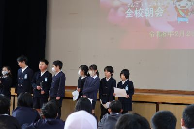 | 保健委員会の子たちが、朝活動の時間に各クラスで呼びかけました。「今日2月18日(水)から2月24日(火)まで、古永町内のチャレンジウィークです。今年のチャレンジウィークのめあては『時間の使い方を考えて、生活習慣を整えよう』です。第3回チャレンジウィークは、からだを動かすことにチャレンジしてみてください。」 | ||||