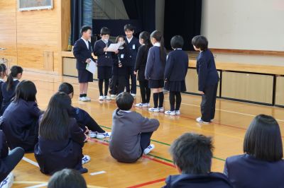 | 今朝の全校朝会のあと、体育館に温かな拍手が響きました。 4年生が中心となって取り組んでいる「朝のあいさつ運動」。その活動を盛り上げてくれている2・3年生の4名に対し、4年生からサプライズで感謝状が贈られました。この感謝状は、「自分たちの『幸動』を一緒に盛り上げてくれてありがとう」という、4年生自身の「考動」から生まれたものです。誰かに言われてやるのではなく、自分たちで考え、感謝を形にする。そんな素敵な「考動」の連鎖によって、本校のあいさつの輪がさらに大きく、明るく広がることを期待しています。 | ||||