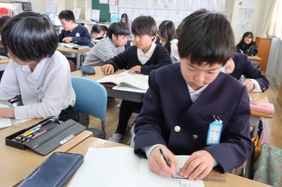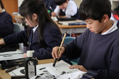 | 3年生から始まった書写(毛筆)の時間。スタートからおよそ1年が経ち、子どもたちの筆運びは見違えるほど上達しました。4月の頃は、「服が汚れないかな?」「墨はどれくらいつければいいの?」と、おそるおそる筆を握っていた子どもたち。今では、正しい姿勢でしっかりと筆を持ち、力強く、そして美しい字を書き上げることができるようになりました。1年間の積み重ねが、確かな自信へとつながっています。 | ||||