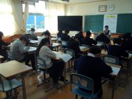 本日5時間目に1年生教室では、3年生による立志証の書き方のレクチャーが行われました。