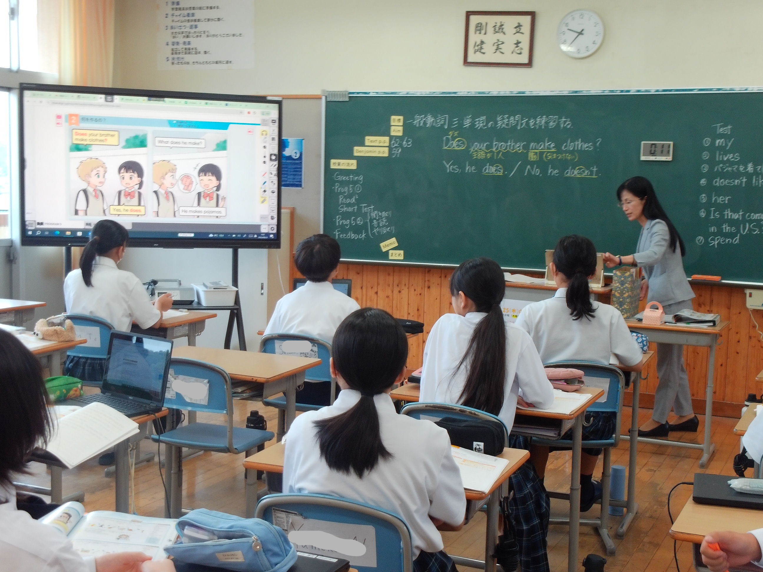 1年生の英語では「Does」を使った疑問文の練習を行っていました。隣の人とペアになって、互い