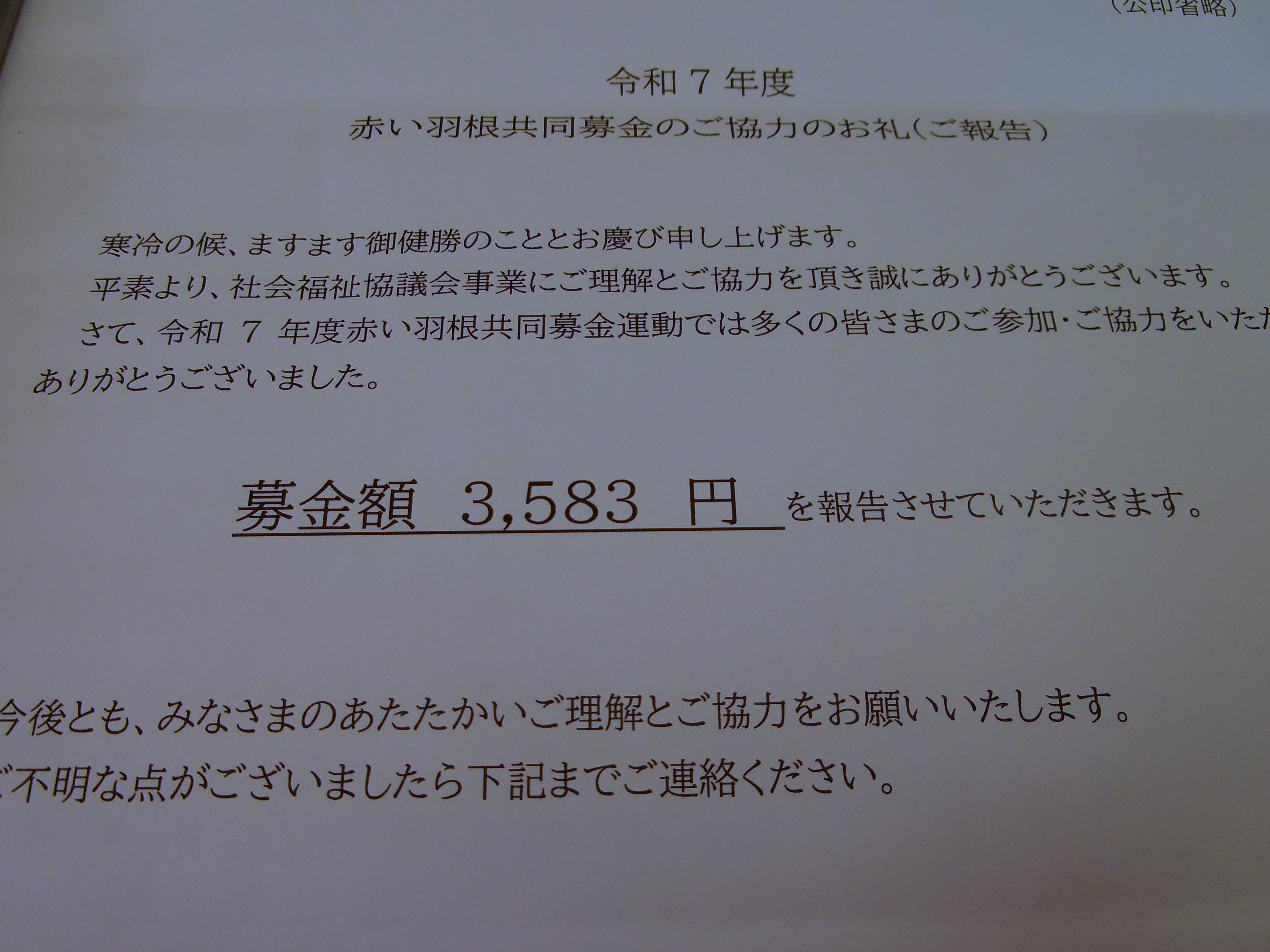 社会福祉協議会から、今年の赤い羽根共同募金のお礼が届きました。「3‚583円」集